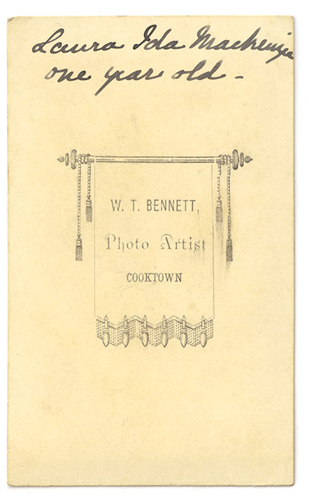 The Register of Births records that Laura Ida Mackenzie was born in December 1875, so William True Bennett probably took this photograph in late 1876. Also see another portrait taken by Albert Lomer in Brisbane around 1878.