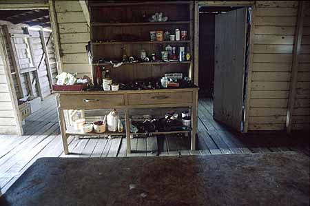In the old kitchen, opposite the fireplace, is this kitchen dresser, used in recent times for storing small tools and other odds and ends. The kitchen table is in the foreground.