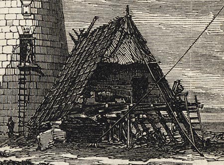 There were many difficulties attending the erection of this edifice. In the first place, the works could only be carried on during the north-east monsoon, or from about the middle of November to the end of April, the force of the sea and violence of the waves during the south-west monsoon being such as entirely to prevent any work on the reef during their prevalence; consequently, at the end of each working season, all tools and temporary barracks erected for the shelter of the workpeople had to be removed. Besides this, the distance from which all materials and workpeople had to be collected caused no small hindrance to the speedy prosecution of the works. On several occasions, also, even during the working seasons, the men had to leave the reef in the event of a severe storm.