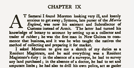 Monckton’s book is a rip­ping yarn of adventure in the colonies. The story begins in Cooktown in 1895 where Monckton found himself at the age of 23, armed with £100, an outfit particularly unsuited to the tropics, and a letter of introduction from the then Gov­er­nor of New Zealand, the Earl of Glasgow, to the Lieutenant-Governor of British New Guinea, Sir William Mac­Gregor. When he met the governor, Sir William had no job to offer anybody who was not conversant with native customs and ways of thought. He recommended that Monckton come back after he had got some experience of life in New Guinea. Mon­ck­ton set off to get that experience​—​through gold mining, trading, ship-own­ing, bar tending and other odd jobs around the colony​—​before being appointed by the governor as a resident magistrate at Samarai in 1897. While he was in that service he met Alex Symons.
