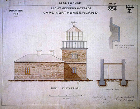 1856 contract drawing for the lighthouse at Cape Northumberland, South Australia, showing the lantern designed by Alexander Gordon. Around 1882 this lighthouse was demolished and replaced by a new tower further back from the eroding shore. The lantern was moved to a new lighthouse at Cape Banks, South Australia, where it is still in service. [National Archives of Australia, item barcode 4957152].