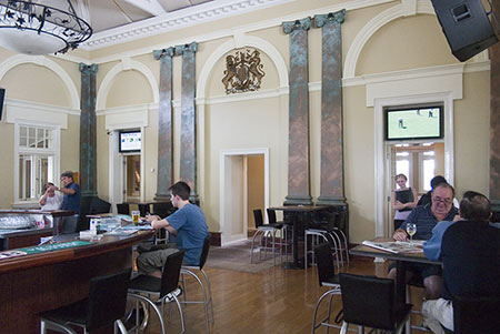 The former Cairns Courthouse, built in 1919-21, is listed in the Queensland Heritage Register. In 1992 the court moved to a new building elsewhere in the city and the old courthouse was sold as part of a large redevelopment site. The former courtroom was adapted for use as a bar associated with a large resort hotel​—​this adaptation was carried out in accordance with a conservation management plan prepared by Allom Lovell Marquis-Kyle Ar­chi­tects in 1995. Major elements of the court furniture were retained during the conversion.