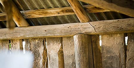 The structure depends on six main posts that extend from the top of the wall down into holes in the ground. By 2008 the bottoms of the posts had rotted and the structure had started to lean. Its condition was precarious.