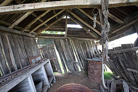 Inside the hut. The represents basic bush carpentry, rather than fine crafts­man­ship. Almost all of the timber was cut on the property and worked by hand with axe, saw, wedge, mallet, adze, auger and chisel.